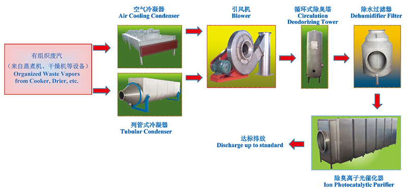 針對魚粉工廠的實際工作情況,我們將廢汽分為兩大類,即有組織廢汽和無組織廢氣。所謂有組織廢汽就是來自蒸煮機、干燥機等設(shè)備在生產(chǎn)過程中產(chǎn)生的大量水蒸氣,該廢汽的特點是溫度高達95C以上,且濃度相當(dāng)高。無組織廢氣是指來自原料池、生產(chǎn)車間及倉庫的有味氣體,該氣體的特點是濃度較低,溫度也不高,但氣量相當(dāng)大。根據(jù)客戶工廠的選址情況及具體條件,我們將有組織廢汽處理工藝分成兩種配套方案,以下是針對這兩種廢汽處理配套方案的工藝說明及流程方框圖。